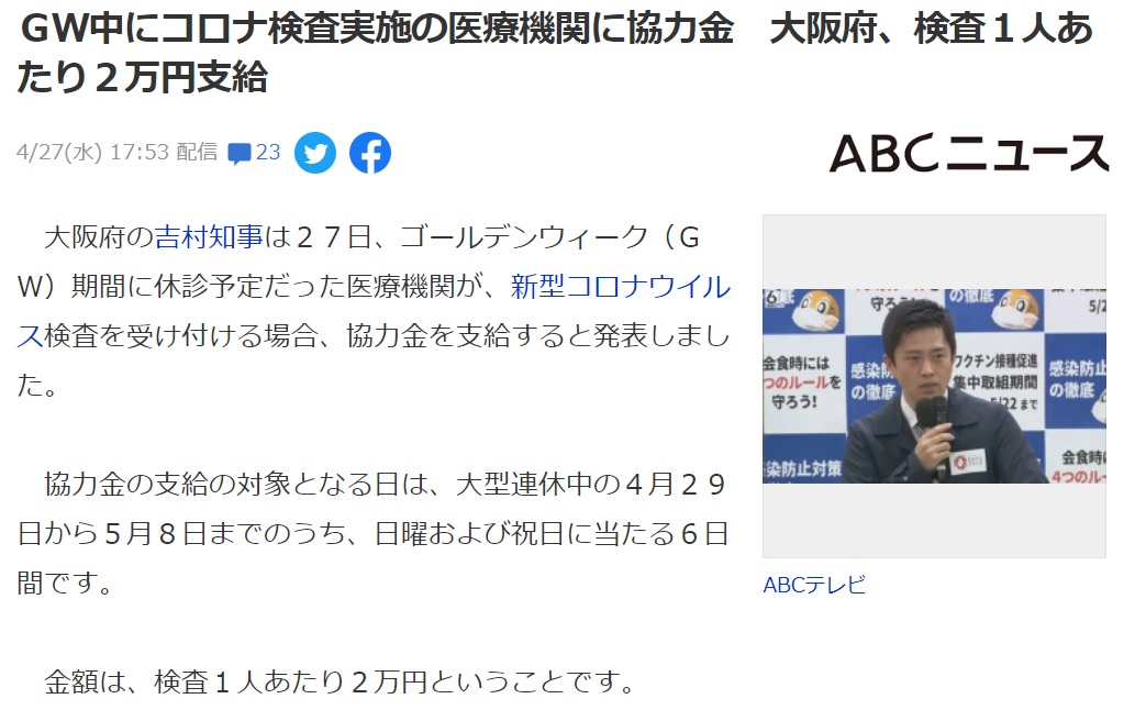 ◆検査一人当たり2万円て妥当なのかな?◆府民の血税からそんな無駄な金を出すのだけは勘弁してくれ◆こんなことやってるから、いつまでも終わらない◆普通の人間が2万稼ぐのどれだけ大変か◆そんなことするからコロナ騒動が終わらない、儲かる人がやめさせない◆医者はざんざん稼いでるぞ。医師会は大笑い。だからいつになっても5類にならない。